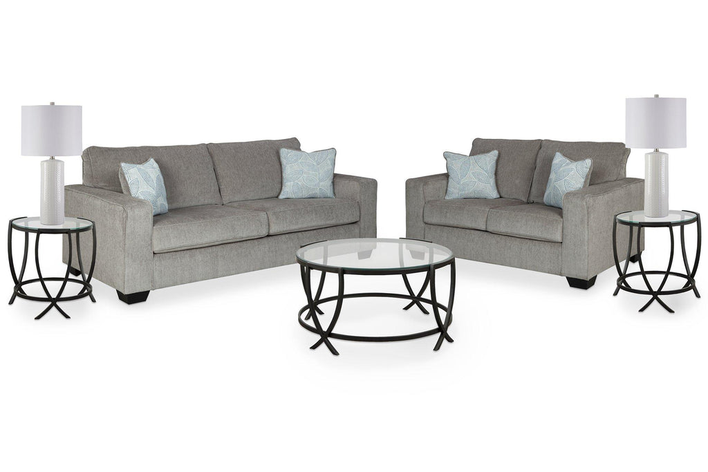 If style is the question, then this room package is the answer. The sofa and loveseat feature clean lines and sleek track arms enhanced with plump cushioning and a chenille-feel upholstery. A clear winner for lovers of contemporary style, the coffee table and end tables make a brilliant impression with a metal arc X-motif. Two ceramic table lamps have bases teeming with texture, proving that a monochromatic design can be visually interesting.