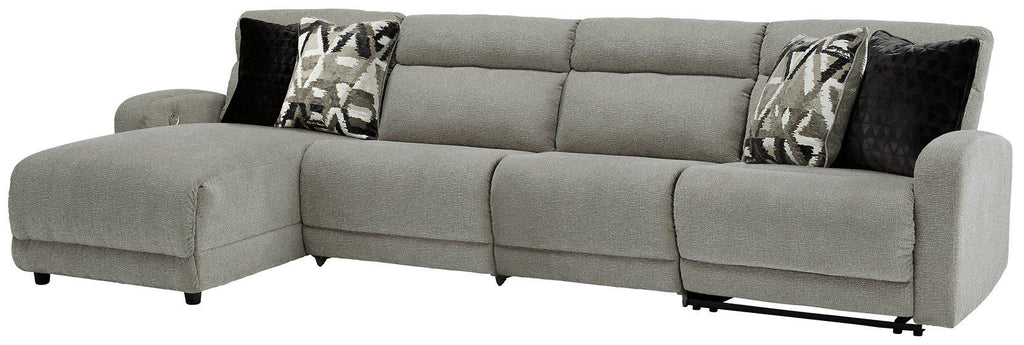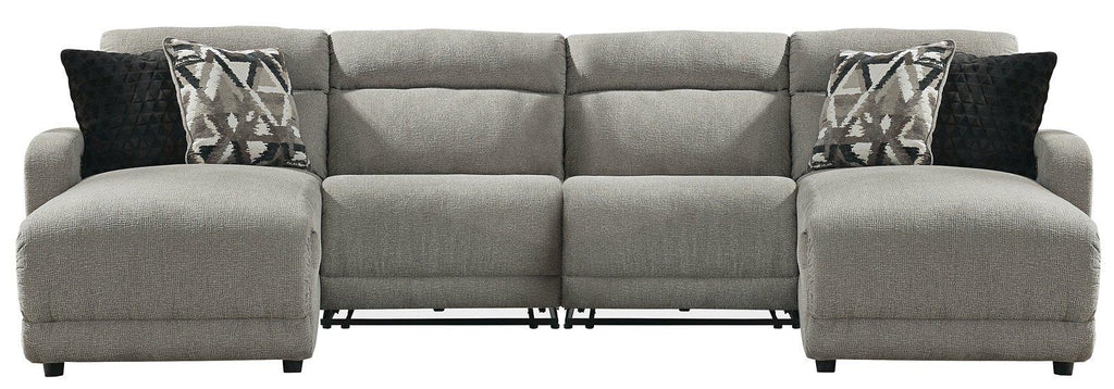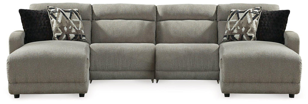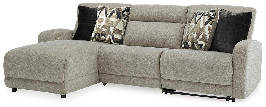 Delightfully modern. Exceptionally comfortable. When it comes to modular furniture with easy-elegant appeal, it’s hard to beat this power reclining sectional. Wrapped in a decadently plush stone-tone fabric for neutral versatility, this chic sectional is dressed to impress with a clean-lined divided back, curved track arms and a low-profile back for a relaxed, contemporary aesthetic.