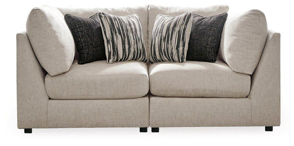 With its casual-contemporary aesthetic and modular design, the Kellway sectional makes way for high style and indulgent comfort. Rest assured, the thickly cushioned storage console includes not only a pair of cup holders, but also a USB port to keep you powered up while you unplug. Wedge-cut armrests are right on point for those who fancy a clean, modern look. Plush-to-the-touch chenille-feel upholstery in bisque beige is pure delight.