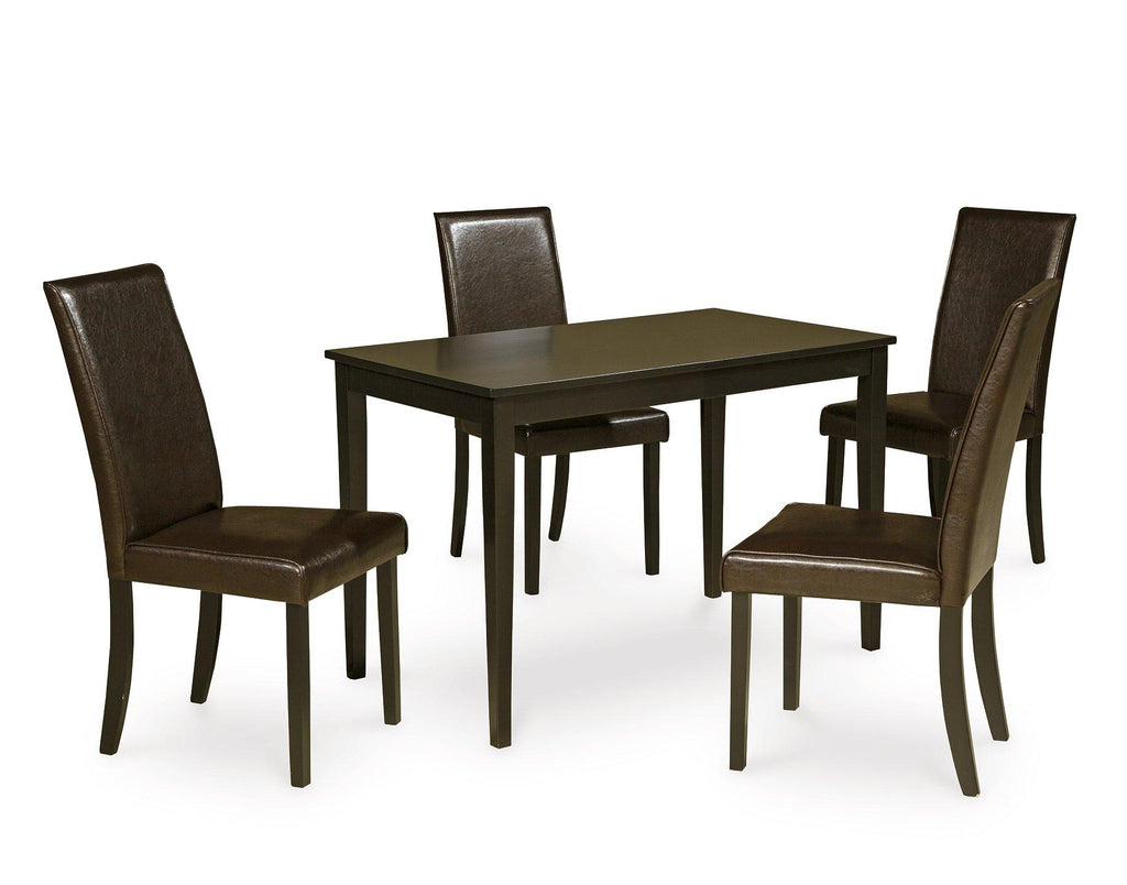 This dining table set might be big on style, but its petite scale is ideally suited for small spaces. Dark finish and minimalist design make this dining table set the epitome of contemporary decor. Four comfortably cushioned high-back chairs covered in a dark brown faux leather make it easy to linger at the table.